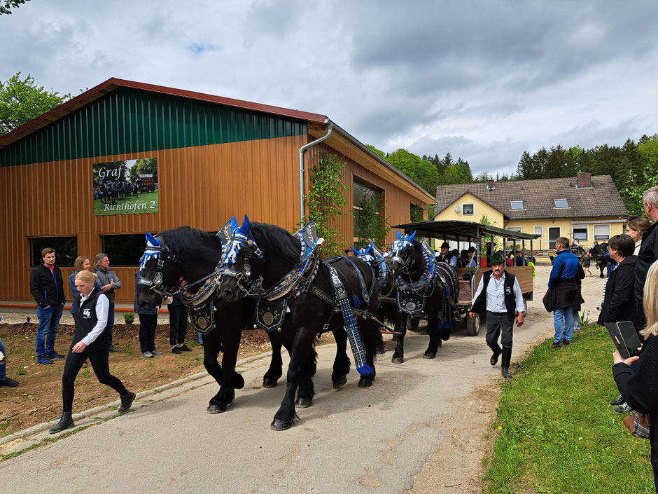 dessen Umzug Musikalisch. Der Zug wurde vom Kreuzreiter Hubert Roggenhofer angeführt. Hubert machte sich gefolgt von den Kutschen und Reitern auf dem Weg durch Richthofen hinaus auf den weg zum